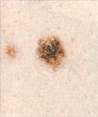 Examples of common moles. The mole at the upper left is 1 millimeter in diameter (the width of the tip of a sharpened pencil), and the other moles in the upper row are 2 millimeters in diameter (the width of the tip of a new crayon). The moles in the second row are slightly larger (up to 5 millimeters in diameter, which is the width of a new pencil eraser).